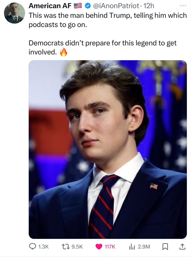 Barron in 2048..Caribbean Hen wrote: ↑Fri Nov 08, 2024 10:37 am F6783B7A-D346-4E1E-BE2F-00331FA457BC.jpegIs this kid old enough for a cabinet position? Looks like he gave Daddy some sound advice